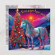 Experience the ethereal beauty of a majestic unicorn as it gracefully stands upon a snowy landscape in the far north. With swirly tattoos adorning its glistening coat, the unicorn's pink and blue mane and tail add a touch of whimsical charm. The scene is set against a breathtaking red sunset sky, framed by towering mountains and a beautifully decorated fir tree. This enchanting artwork captures the essence of the holiday season and the magic it brings. On the back to a charming background is a seasonal quote and a place to to and from and most text on the card can be personalised,