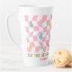 Tis The Season Groovy Pink Retro Coquette Christmas Personalised Name Festive Holiday Latte Mug features the text "Tis The Season" in modern script typography accented with Christmas trees and bows on a pink chequerboard with your custom personalised name below. Perfect for Christmas gifts, Christmas parties and holiday celebrations, birthdays and more. Created by Evco Studio www.zazzle.com/store/evcostudio