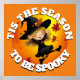 Tis the season to be spooky and a cute witch in a black hat is dancing in fall leaves.