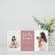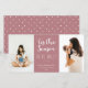 Festive 'Tis The Season To Be Jolly, white Christmas typography quote, dusty rose mauve holiday photo card. Card features, two template photo spaces on front. Back of card is complimented with white doodle dot frame on matching rose colour background. Template text spaces for message and names.