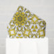 Intricate arabesque pattern featuring symmetrical floral motifs in black, white, and yellow. Each motif consists of a central flower surrounded by petal-like shapes, forming a circular arrangement. Heart-shaped elements fill the spaces between motifs. The design is on a white background, creating a striking contrast with the detailed linework. This style is reminiscent of traditional Middle Eastern ornamental art, emphasising symmetry and repetition.