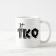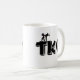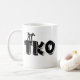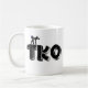 TKO written in Asian style font, black English writing. On the top of the technical knock out initials are the silhouettes of two MMA fighters are sparing, one wearing blue gloves & one red, which are the traditional MMA colours.