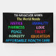 To Whoever Wins, The World Needs Justice, Peace, Fairness, Equality, affordable health care outdoors banner.