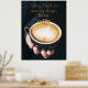 A close up photo of a hand holding a cup of cappucino and a coffee quote "Today I will do amazing things. But firts, coffee"