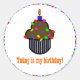A sticker featuring a border of red, green, purple, and blue dots. Illustration of chocolate cupcake topped with colourful sprinkles and a blue candle. Text reads, "Today is my birthday!" but can be changed to other text of your choice. Background colour may also be customised.