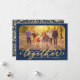 This elegant Christmas photo greeting card celebrates being together again with loved ones in 2025! The design can be fully-personalized with your favorite landscape photo, a Merry Christmas (or other) greeting, family name, and year. Features a deep blue background with a subtle painted texture, faux gold foil script lettering, and an ached photo space. A modern pattern of little gold stars dresses up the back of the card.