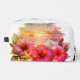 This beautiful toiletry bag features a stunning tropical design that captures the peaceful essence of a seaside sunset. With vibrant hibiscus flowers in shades of pink and purple, paired with soft blue-green leaves, the artwork creates a calming and elegant look. The addition of delicate seashells and starfish enhances the coastal theme, while the glowing ocean sunset in the background brings warmth and a dreamy atmosphere to the overall design.