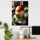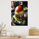 Indulge in a taste of Tokyo with this exquisite Japanese Teriyaki Burger. A premium wagyu beef patty, glazed with a rich and savory teriyaki sauce, is topped with a delicate wasabi mayo, crisp shredded cabbage, and all nestled within a soft, toasted rice-flour bun. A small Japanese flag adds an elegant touch, while chopsticks rest beside the plate, completing this culinary masterpiece.
