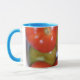 A white mug with blue rim and handle, decorated with a photo of ripening tomatoes