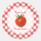 Customisable retro stickers for homemade tomato sauce and salsa with fresh tomato on red and white gingham tablecloth pattern.
