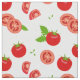 Red and white fabric featuring juicy red tomatoes, tomato slices, and little green leaves.