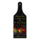 Paddle shaped black glass cutting board with a quote that says, "The best of times are always found when friends and family gather round. Features a macro photo of red and green tomatoes with a muted brown and grey background. Just enough colour to brighten up the kitchen and add a warm inviting atmosphere. Perfect for serving or cutting. Several matching products available.