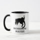 Silhouette image of a lazy black cat with green eyes, laying on its back, grey text Morrrow. Maybe. Cat's footprints instead of dots. Funny, elegant, one of a kind coffee mug for anyone.