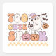 Cute, colourful, fun Halloween design featuring a ghost with a witch hat and pumpkin, several jack o lanterns, and text off lavender, yellow, pink, orange, and white that reads Too Cute to Spook!