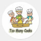 Too Many Cooks design shows three cooks with spoons in hand arguing over a pan. Illustrating the old adage with "too many cooks" wording below. A humorous cooking graphic.
