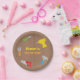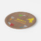 This paper plates features a red saw, a green screw driver, an orange wrench spanner, a blue hammer and a yellow drill arranged in a circular layout. Wood grain texture for background. Personalize easily with your party message. Perfect for a build and construct theme birthday party!