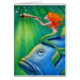 Reproduced from the original mermaid art painting by Sue Halstenberg. A mermaid sits atop a large unhappy blue fish and toots her own seashell horn.
