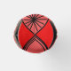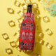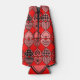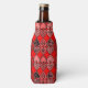 This bottle cooler has a Valentine's design of hearts with tops to tops and bottoms to bottoms with graphics inside on a field of red.