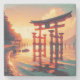 An iconic LoFi art style of a floating torii gate rises from tranquil waters, embodying the spiritual stillness of Japan.