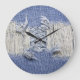 Torn blue denim: jeans texture. large clock