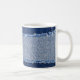 Destroyed torn denim blue jeans fabric frame on blue jeans background. Worn Jeans Casual Double Colour patch Denim.