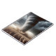 A dramatic tornado swirls violently above a wheat field with dark storm clouds looming overhead and flying debris