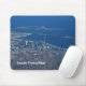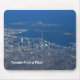Photo of downtown Toronto from the air as coming in for a landing on a plane from Europe. You can see the CN Tower, a major tourist attraction, Harborfront, and beautiful blue Lake Ontario with the Toronto Islands.