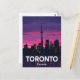 Capture the dazzling nightlife and iconic architecture of Toronto, Canada, with this stunning postcard. It features the famous Toronto City Tower dominating the downtown skyline silhouette against a vibrant pink and purple sunset. Designed in a cool retro travel poster style, this postcard is perfect for sending greetings, keeping as a memento, or framing as a piece of wall art. Ideal for Canadians, travelers, and city enthusiasts who love modern landmarks and bold, colorful designs. The image showcases the beautiful waterfront and city views from Lake Ontario.