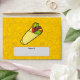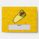 Cartoon illustration of tortilla sandwich wrap. Junk food outline icons yellow pattern background. Custom text.