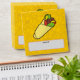 Cartoon illustration of tortilla sandwich wrap. Junk food outline icons yellow pattern background. Custom text.