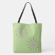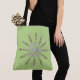 Starburst pattern created with a copper chain and pale yellow beads. In the centre a bead is a painted flower in blue, white, and red. Chain segment is replicated six times, so that the ends point to the twelve points of a clock (where the numerals would be). Medium green background. Front shows a large, single starburst. Reverse side shows two smaller starbursts.
