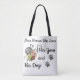 Tote bag with paw prints, flowers, yarn and knitting needles. Says, I'm a Woman who Loves Her Yarn and Her Dogs. Cute tote for carrying yarn or anything. Great gift for mum, daughter, teacher, friend or anyone who loves knitting and dogs.
