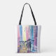 Tote bag with watercolor scene of couple sharing an umbrella after the rain.