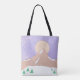 This tote bag is designed with a depiction of a snowy mountain under a lavender sky with a full moon.