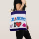 Medium-sized fabric bag with an interesting graphic print. Made of durable polyester, with cotton handles and laminated lining.