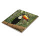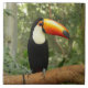 In a lush tropical rainforest, a vibrant toucan perches gracefully on a moss-covered tree branch, its striking, oversized beak contrasting brilliantly against the verdant foliage. The bird's iridescent plumage and intense gaze make for a captivating image, showcasing the beauty and exotic allure.