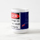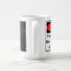 DANGER! Touching things on this desk may result in serious injury. Funny mug. One side has a warning sign, the other side has a body outlined in chalk touching the legendary 'red stapler' of office lore. The background colour gradients from a dark blue, to sidewalk crime-scene black.