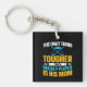 Hockey theme keychain for the hockey mum with hockey pucks and sticks with text of white, yellow and blue that reads The Only Thing Tougher Than a Hockey Player is His Mum!