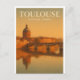 Vertical travel poster (2:3) of Toulouse — France, panoramic riverfront view of the Pont Neuf bridge over the Garonne River, with the brick dome of La Grave and warm terracotta architecture reflected on calm water at golden hour.