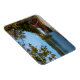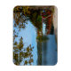 Rectangular photo magnet of traditional colourful tourist boats in Lake Bled under a chestnut tree in fall colours in an autumn landscape in Slovenia.