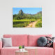 Canvas landscape print of a female tourist cycling on a dirt road with Rotui mountain in the background on the tropical island of Moorea, near Tahiti, in French Polynesia.