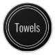 This black knob has white display text. You can edit it to show what's inside the drawer or cabinet. (Shown: Towels) Two white circles form a border for the text.