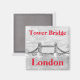 This fridge magnet features the London Tower Bridge, embossed black and white, as seen from the Thames River. The words "Tower Bridge" are in bright red above the bridge, and the word "London" is displayed, also in bright red script, towards the bottom of the magnet. Customize / personalise as you would like to. A nice gift for Christmas, birthdays , or as a British souvenir / keepsake of London in the UK.