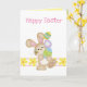 This brown rabbit is carefully caring a tower of colourful Easter eggs. As the rabbit slowly moves he notices a little bee buzzing around. Th background border is made up of yellow daisies. There's a text box on the inside for you to add your own message.