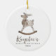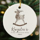 Toy Reindeer Baby's First Christmas Ceramic Ornament — The precious personalised xmas ornament template features an adorable watercolor toy reindeer rocking horse. The text boxes allow for easy customisation of any baby's name in a handwritten calligraphy script font, and birth year in a simple, minimalist sans serif. Both sides of this personalizable, gender neutral keepsake tree decoration are identical.
