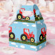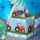 Toy tractor tiled pattern on a light blue background, with clouds and grass. Graphic design ideal for nursery decoration or gifts for young children.