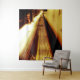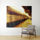 In the original photograph by ZoeSPEAK on this Wall Tapestry, passengers in the distance disembark from the train stopped on Track 2. Bright sunlight strikes the top of the shiny metal train, and a sign with the date and time can be seen hanging under the platform roof, with the rest of the train and platform in shadow.