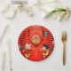 Festive traditional Chinese greeting with firecrackers, Lucky knots and auspicious clouds + golden Two young tigers paper-cut into a circle (model n°02) + two cute children to wish Happy New Year. Design on party paper plate. Matching paper napkin, standard greeting card, square flat card and red envelope. Perfect for Chinese New Year of the Tiger 2022.