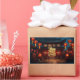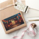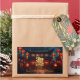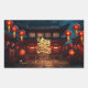A Chinese temple at night with traditional lanterns as background for a golden Dragon with ideogram paper-cut, 2024 (customisable) and golden "year of the Dragon". Design on rectangular sticker. Matching greeting card.