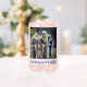 The text, "Finding in Temple" is displayed at bottom in violet lettering. Reverse features the text from Luke 2:48, 51 explaining the Mystery. The Latin phrase meaning "Seek His grace in all things" is displayed across bottom. Designed to accompany the Traditional Christmas Joyful Mysteries Drinkware set, which contains only the first four Mysteries. This glass makes the set complete!